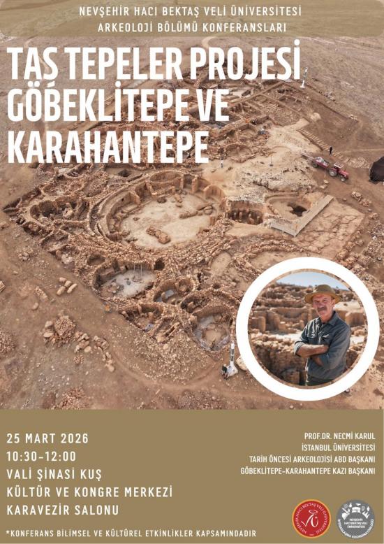 İstanbul Üniversitesi Tarih Öncesi Arkeolojisi Ana Bilim Dalı Başkanı Prof. Dr. Necmi Karul tarafından, üniversitemiz Vali Şinasi Kuş Kültür ve Kongre Merkezi Karavezir Salonunda 25 Mart Çarşamba günü saat 10:30’da “Taş Tepeler Projesi: Göbeklitepe ve Karahantepe” adlı bir konferans verilecektir.